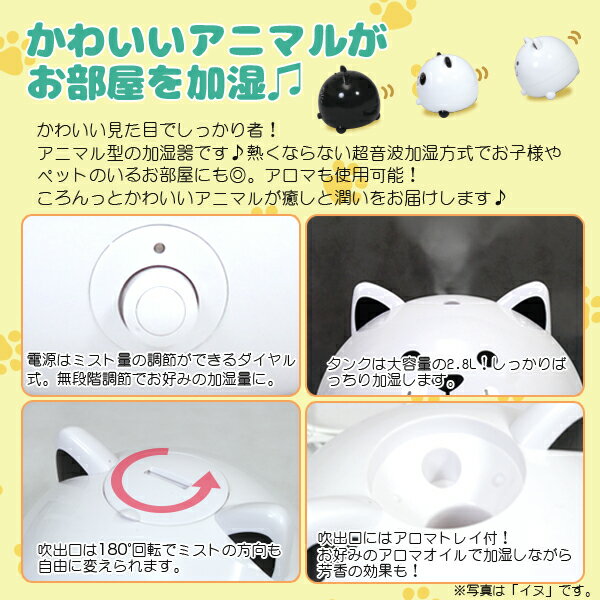 【商品詳細】 消費電力:23W サイズ(約):Φ24×21cm タンク容量(約):2.8L 重量(約):900g 加湿量:max200ml/h 適応床面積(約):木造和室3畳/プレハブ洋室6畳 コード長さ(約):150cm 運転音:35dB 材質:ABS樹脂